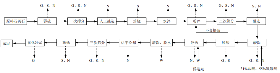 项目主要生产工艺流程为:原料接收,鄂破、一次筛分,人工挑选,焙烧,水淬,粉碎、二次筛分,磁选,酸洗,脱酸,浮选,清洗,脱水,烘干、冷却,三次筛分,磁选,氯化,冷却、/p>