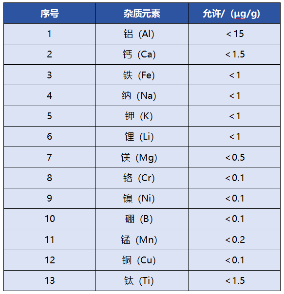 杂质元素含量9/strong>高纯石英砂杂质元素总含量应?0 μg/g,其中钾、锂、钠含量总和?.5 μg/g,各杂质元素含量应符合表2的规定、/p>