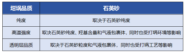 石英坩埚的寿命是其综合品质的体现,其中,纯度保证了坩埚不会形成太厚的析晶层,高温强度保证了坩埚长时间运行不变形塌边,透明层品质保证了拉晶过程的顺畅、不断线。而石英砂的纯度、羟基含量、气液包裹体及石英砂的粒度都等影响着石英坩埚的品质、/p>