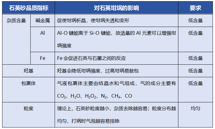 石英砂原料杂质含量高会导致坩埚破裂及影响单晶生长。如果Na、K、Li、Ca等杂质元素含量高,会促使坩埚析晶,使坩埚失透和变形,影响坩埚的力学性能、电阻分布,造成坩埚塌陷。另外,过渡金属(Cr、Cu、Fe等)含量过高时,会使石英坩埚产生色斑或引起高温变色,影响光透过率、/p>