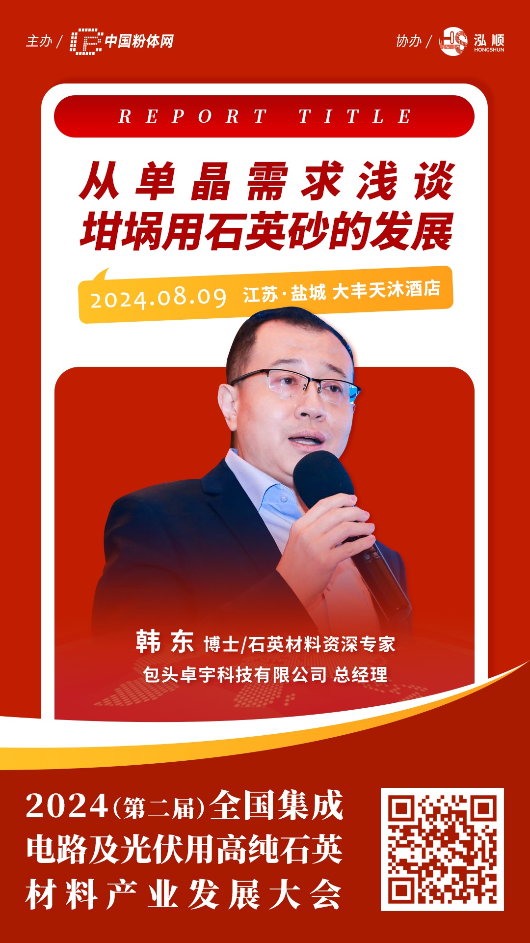 总之,现阶段,单晶技术要求石英坩埚朝着长寿命、大尺寸、低成本、高纯度及品质一致性的方向发展,这就要求其原材料高纯石英砂的颗粒分布均匀、纯度高、且一致性好?024??日,由中国粉体网主办皃span style="color: rgb(192, 0, 0);">?024(第二届)全国集成电路及光伏用高纯石英材料产业发展大会“/strong>将在江苏盐城召开+strong>包头卓宇科技有限公司总经理、石英材料资深专家韩东博?/strong>将做《从单晶需求浅谈坩埚用石英砂的发展《/strong>的报告,届时,他将深度解读单晶技术发展对坩埚的要求、解决方案以及坩埚关键性能对于石英砂的需求、/p>
