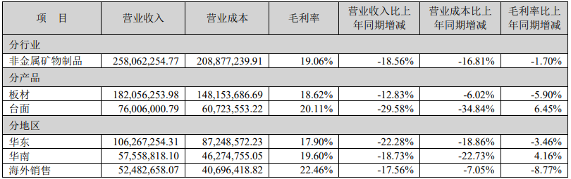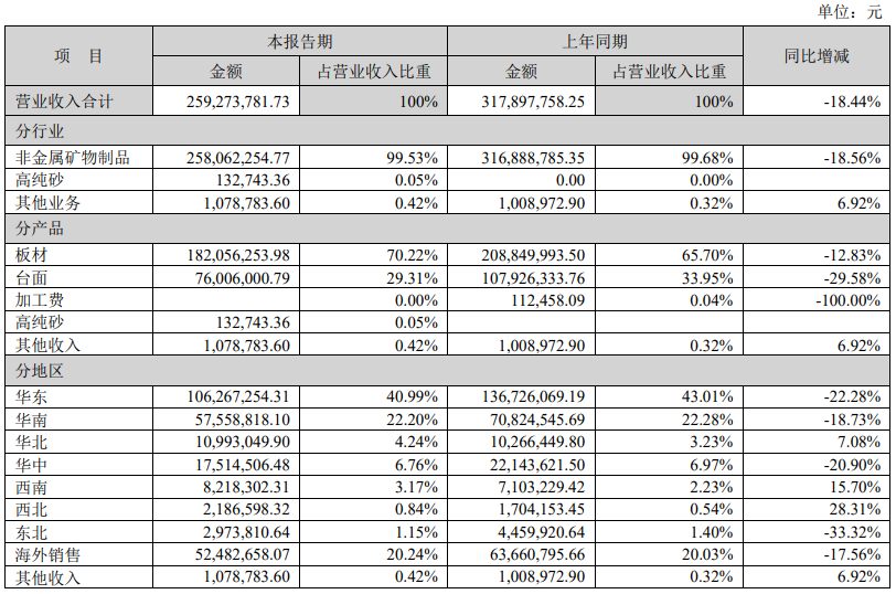 截至报告期末,公司及控股子公司现有中国发明专?0项,美国发明专利2项,实用新型专利64项,计算机软件著作权12项,是《人造石(JC/T 908-2013)》、《建筑装饰用人造石英石?JG/T 463-2014)》、《树脂型合成石板?GB/T 35157-2017)》等行业标准的主编或参编单位。公司生产的石英石产品已通过美国ASTM标准检测、美国NSF认证等多个国家或地区的权威标准认证,产品远销北美洲、大洋洲、亚洲、欧洲等地、/p>