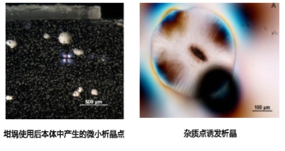 由于采用低档次石英砂或者在生产制程中的污染而带来的坩埚中的杂质含量过高,往往会带来石英坩埚在本体上的析晶,如果析晶靠近内表面,则由于局部的析晶壳层过厚而极易脱落使单晶拉制无法继续。如果析晶造成外壁较厚的析晶,这种现象往往伴随着坩埚外壁在析晶前期已经过度软化贴紧石墨坩埚,而极易产生在底部或者弧度的鼓包现象。如果这种析晶有可能贯穿坩埚本体的话,就会引起漏硅等一系列严重后果、/p>