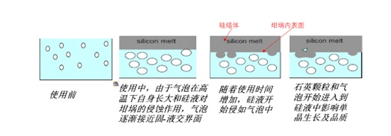 石英砂中的气液包裹体在高温熔制石英玻璃的过程中,H2O能与SiO2熔体发生反应,使得羟基含量增高,造成气泡增加。坩埚最内表层是指透明层中最靠近内表?-2mm的部分。在使用过程中,坩埚对硅液起作用的机理——由于与硅液接触的内表面不断向硅液中熔解,并且伴随着透明层中的微气泡不断的长大,靠近最内表面的气泡破裂,伴随着硅液释放石英微颗粒以及微气泡。而这些杂质会以微颗粒以及微气泡的形式伴随着硅液流遍整个硅熔体,直接影响到硅的成晶(整棒率、成晶率、加热时间、直接加工成本)以及单晶硅的质量(穿孔片、黑芯片等)、/p>