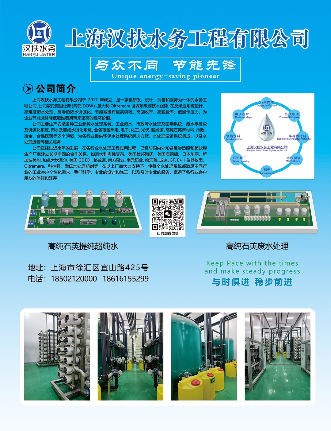 上海汉扶水务工程有限公司成立?017年,主要经营水利水电建设工程,工业纯水废水水理工程,水处理设备安装,空气净化系统安装,水处理领域内技术研发技术服务,高难度废水处理中水回用,水处理系统托管运维,反海透浓盐水资源化节能减公司依托意大利奥纯赛芮公司美国杜邦陶氏膜技术优势,在反渗透系统设计,高难度废水缩,反渗透浓盐水资源化节能感排有更高的突破在系统设计中充分发挥技术优势,高回收率,脱盐率,低运行压力,在浓盐水回收中可以达到80%回收率,系统运行稳定,节能减排明显,经效益高,公司八字方针好用、耐用、节能、减排头企业节能减排降低运维费用提高水利用率做出献,汉扶水务只做优质水务工程上海汉扶水务与国内知名环保企业环球水务工程集团有限公司合作,业务拓展辐射面有全国各地,技术服务快捷高效,环球水务工程集团,是中国制造环保水处理最早的专业厂家之一,集设计、生产制造、工程总承包大型环境工程集团公司,公司拥有环保工程设计乙级资质,建筑安装工程壹级,机电安装工程壹级资质,国家亮新技术企业,中国环保百强企业、/span>