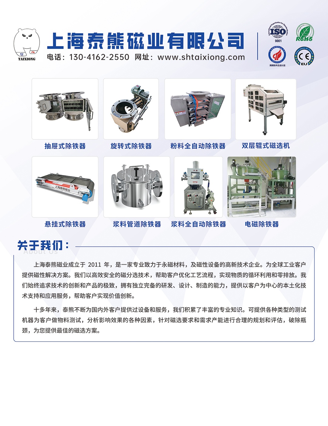上海泰熊磁业有限公司是专业从事磁性材料的研发、生产、加工、销售为一体的生产型企业。经过多年的市场历练,泰熊已经在磁性事业上踏上了新的征程。公司产品跨四大领域十四大系列,从橡胶磁材到受磁材料,逐步扩展到磁性广告材料、磁性制品等领域,从片状胶磁、卷状胶磁系列到磁性漆、电梯磁、磁性广告、冰箱贴磁等系列 公司通过不断的引进专业人才和先进技 ,与国内外朋友广泛合作,共同研制、开发生产,满足广大用户的需求。产品已经深受国内外市场客户的青睐。在客户中树立了良好的口碑形象、/p>