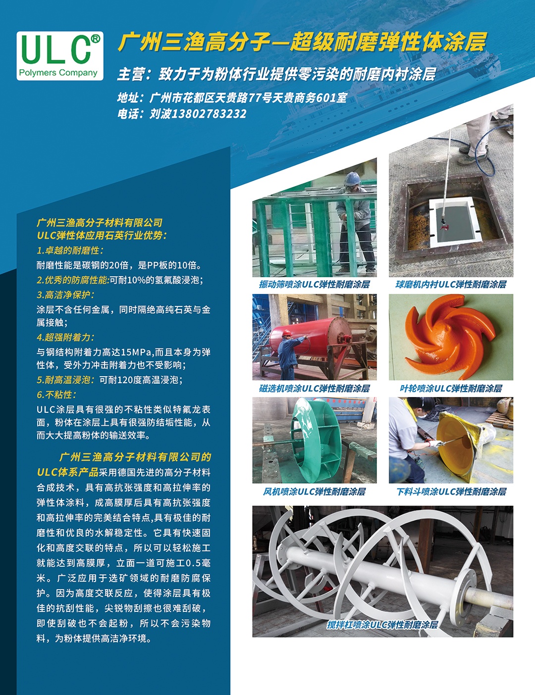 广州三渔高分子材料有限公司专注可喷涂高分子弹性体材料的研究及开发,引入德国可喷涂高分子弹性体材料生产技术,经过多年国内实践应用,公司产品已经在多个严重磨损领域和重防腐领域得到广泛的应用,特别是在强酸性或强碱性同时又是磨损严重的工况环境下,高性能的高分子弹性体涂层能够提供卓越的保护。例如重度磨损领域选矿设备:磁选机滚筒耐磨保护、渣浆泵叶轮及泵体耐磨保护、重型选矿振动筛耐磨保护、浮选槽及浮选转子浮选轴耐磨保护、螺旋分级机叶片耐磨保护、三通及弯头耐磨保护、玻璃钢螺旋溜樯耐磨保护、玻璃钢圆锥耐磨保护等。在自动化领域也有广泛的应用,例如振动盘耐磨降噪?耐油重工件振动盘,电子元件防静电振动盘等。重防腐领域例如硫酸池重防腐、化工厂废水池重防腐、酸性平台重防腐、重防腐地坪、化工搅拌槽及搅拌杠重防腐等。大大减少用户因磨损和腐蚀带来的损失、/p>