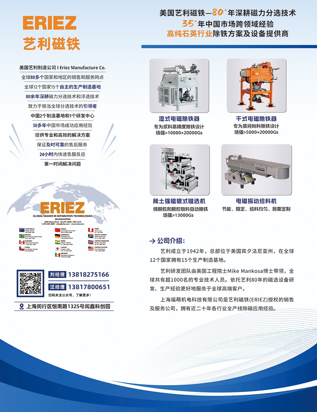 艺利磁铁(ERIEZ Magnetics)总部位于美国宾夕法尼亚州伊利湖畔。自1942年美国人O.F.Mervin先生创立至今,公司致力于在全球范围内设计,开发,制造和销售磁分离,金属探测,振动,物料输送和控制等领域的设备。艺利全球共?2家制造分公司,覆?0多个市场,为20多种不同的生产领域提供先进设备、/p>