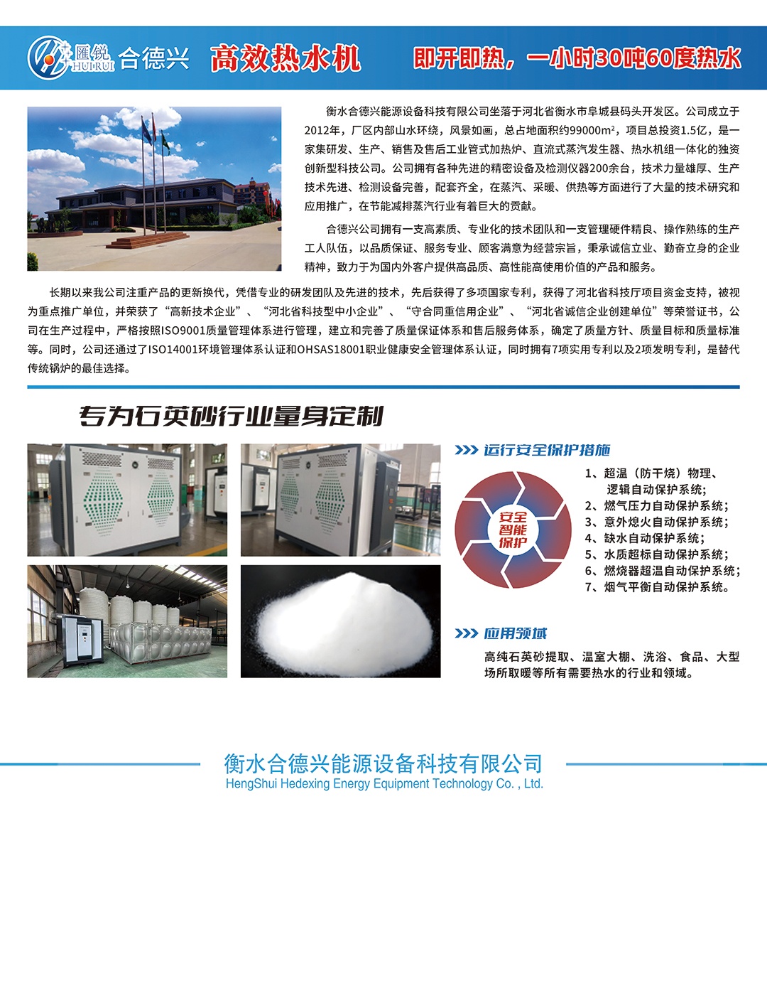 衡水合德兴能源设备科技有限公司由东光县盛沃节能设备有限公司和东光县华立石化机械厂投资兴建,公司位于衡水市码头开发区,是一家集研发、生产、销售工业管式加热炉及蒸汽发生器一体化的合资创新型科技公司。公司主要经营产品:全预混冷凝蒸汽发生器、低氮蒸汽热源机,低氮热水机、石油化工管式加热炉等。具有完善的冷热换热技术和水汽分离系统,采用平板式全预混陶瓷燃烧器,逆向燃烧等先进技术,具有安全、节能的优势特性。公司本着以客户三个满意为基本原则“质量的满意、先进技术的满意、服务的满意”,不断加强企业内部的综合竞争力,公司在竞争中求发展,在挑战中谋机遇,相信公司会给您提供高端、先进的蒸汽设备、/span>