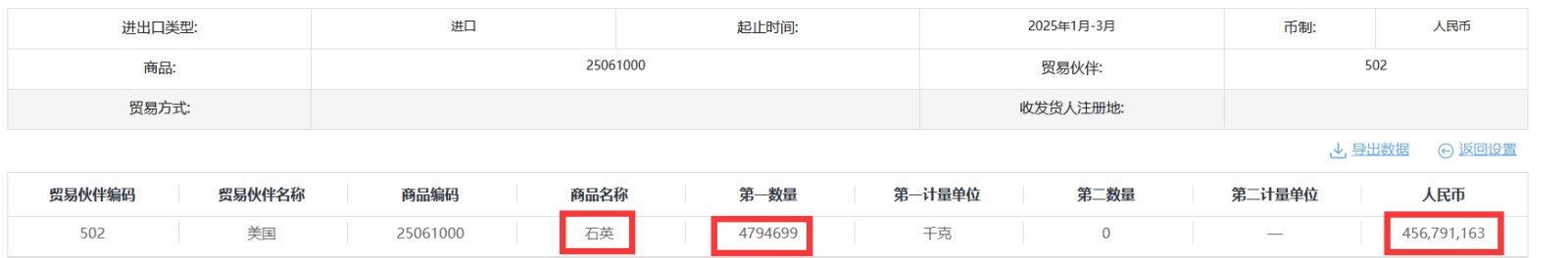 到了2025年第一季度,进口砂的均价居然还在涨?025第一季度,中国从美国进口高纯石英砂约0.48万吨、金额约4.57亿元,均价约?.53万元/吨,超过2024年的均价8.65万元/吨,也超过了去年第四季度的均?.83万元/吨、br/>