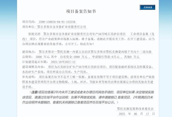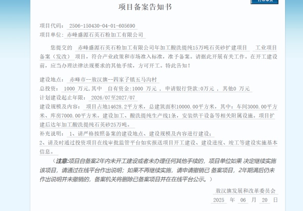 内蒙古投资项目在线审批办事大厅发布了鄂尔多斯市金齐泰矿业有限责任公司年产50万吨石英砂岩项目和赤峰盛源石英石粉加工有限公司年加工酸洗提纯15万吨石英砂扩建项目备案公示、/p>