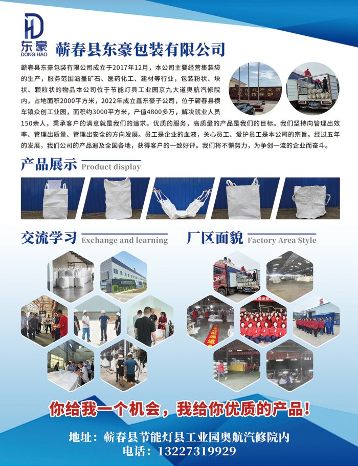 蕲春县东豪包装有限公司成立于2017?2月,本公司主要经营集装袋的生产,服务范围涵盖矿石、医药化工、建材等行业,包装粉状、块状、颗粒状的物品本公司位于节能灯具工业园京九大道奥航汽修院试瑜探部内,占地面积2000平方米,2022年成立鑫东豪子公司,位于春县横车镇众创工业园,面积约3000平方米,产?800多万,解决就业人?50余人,秉承客户的满意就是我们的追求。优质的服务,高质量的产品是我们的目标。我们坚持向管理出效率、管理出质量、管理出安全的方向发展。员工是企业的血液,关心员工、爱护员工是本公司的宗旨。经过五年的发展,我们公司的产品遍及全国各地,获得客户的一致好评。公司将不懈努力,为争创一流的企业而奋斗、/p>