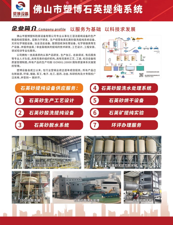 佛山市塑博塑料防腐设备有限公司专业从事化工湿法提纯设备的生产制造和经营服务,是致力于研发、生产经营各类石英砂酸洗提纯系统设备光伏化学储能设备、冶金浸出设备、酸雾回收净处理设备,化学容器类等生产设?并提供金?非金属相关的提纯的技术研发、工艺设计、工程安装、调试培训专业化服务、/p>