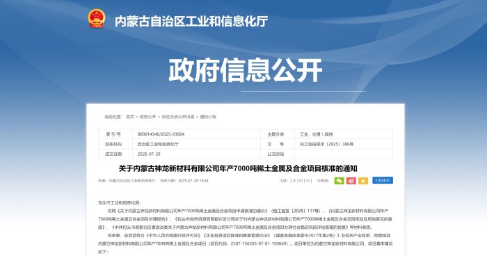 中国粉体网讯近日,内蒙古自治区工业和信息化厅同意核准内蒙古神龙新材料有限公司(以下简称“神龙新材料”)年产7000吨稀土金属及合金项目、/span>