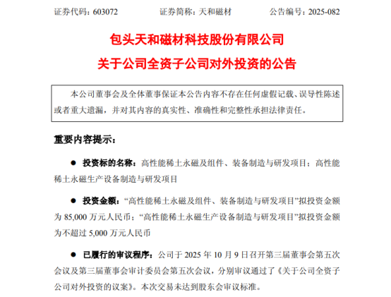 另一全资子公司天之和则计划投资不超过5000万元,专门从事稀土永磁生产设备的制造与研发。这一项目预计建设?4个月,开工时间更早,计划2025?0?5日启动、/span>