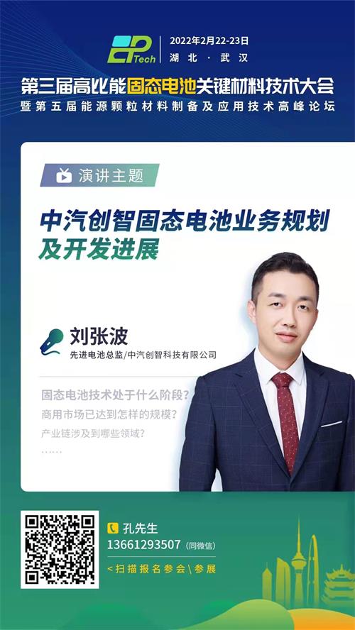 为推动行业交流,2022??2-23?/strong>,由中国粉体罐/strong>主办的‛span style="color: rgb(255, 0, 0);">第三届高比能固态电池关键材料技术大伙/strong>”将于湖北武汉东方建国大酒店举办,届时将邀请来?strong>中汽创智科技有限公司皃strong>刘张泡/strong>总监作〉span style="color: rgb(255, 0, 0);">中汽创智固态电池业务规划及开发进屔/strong>》报告、strong>本报告将重点介绍中汽创智针对固态电池业务的规划布局,以及在相关平台建设、固体电解质研制、全固态电池相关工艺及装备开发方面的进展及下一步计划、/strong>