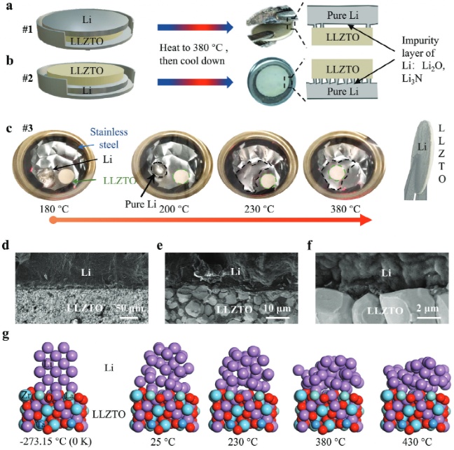 ?加热过程中液态锂的固体杂质层对液态锂石榴石浸润性的影响。a)实验#1:锂在LLZTO上方。b)实验#2:锂金属在LLZTO下方,两者的示意图、结果图和解释图都无法去除加热过程中形成的杂质层。c)实验#3(及时去除杂质?,锂金属在不同温度下的状态及浸润过程。d-f)实验#3得到的锂-石榴石良好界面的SEM照片。g)不同温度下锂团簇在LLZTO上存在的分子动力学模拟结果、/p>