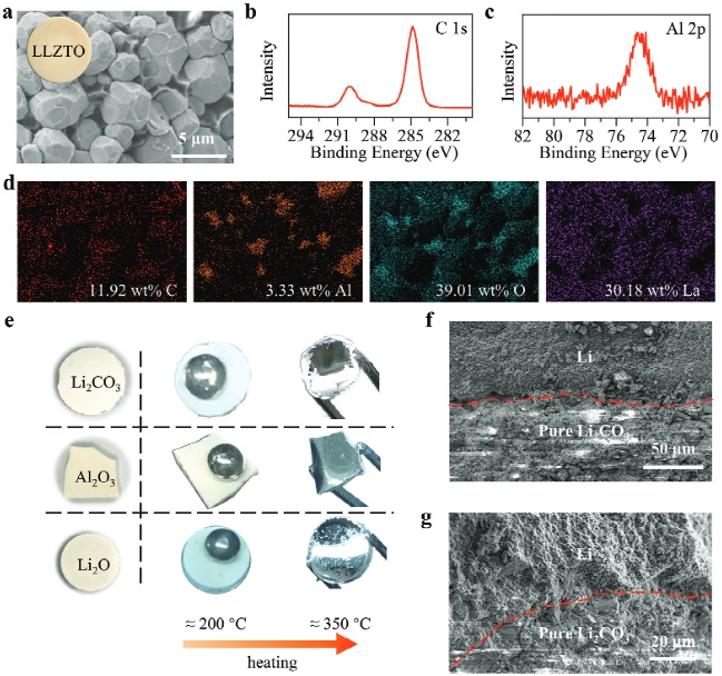?LLZTO上杂质的高温疏锂/亲锂性跃迁。a)LLZTO石榴石薄片的光学照片和SEM照片。b)C1s和c)Al2p在石榴石表面的XPS结果。d)元素C、Al、O和La的EDS图谱及其质量比。e)Li2CO3、Al2O3和Li2O?00°C?50°C的亲锂性。f,g)Li-Li2CO3界面的SEM照片、/p>