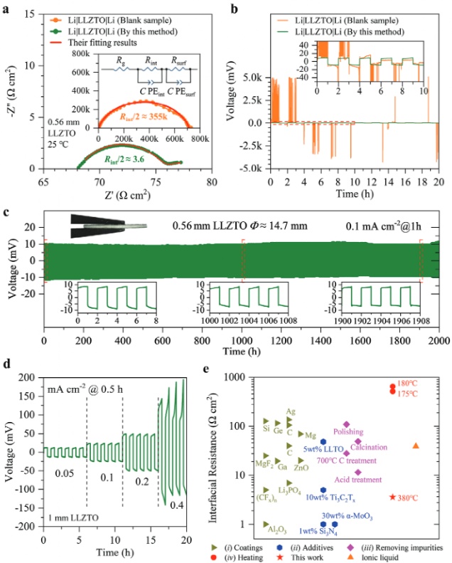 ?Li|LZTO|Li对称电池的数据对比。a)该方法处理前后Li|LLZTO|Li的EIS及其拟合结果。b)0.1mAcm-2@1h处理前后Li|LLZTO|Li电池的电压曲线。c)0.1mAcm-2@1h下Li|LLZTO|Li电池数据的长循环性能。d)不同电流密度下Li|LLZTO|Li电池的性能(0.05~0.4mAcm-2@0.5h)。e)不同方法得到的锂-石榴石界面电阻对比、/p>