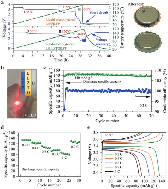 为了证明所提出方法的实用性,制作了全电池,并首先在加速量热仪(ARC)中测试了它们的耐高温性能。将单面Li包覆的LLZTO薄片和LFP阴极(80wt%LFP,?mgcm-2)一起加压到CR2032外壳中,形成Li|LLZTO|LFP全电池。图5a为高温阻性电池实验中电池电压和温度的变化情况。当?5?尼龙密封圈的熔点:230~280?加热?65?尼龙密封圈的熔点:230~280?时,观察到液体电解质电池的三个电压降和一个最终短路。三个电压降分别标记为I、II、III,对应的温度分别为≈45?15?50℃。这些电压降可能与液态电解质(DE沸点:126~28?的泄漏和分解,以及有机隔膜的熔化有关。同样,固体电解质电池从室温?70℃经历了三次电压?也标记为Ⅰ、Ⅱ、Ⅲ),但固体电解质电?55?20?60?每次电压降的起始温度略高于液体电解质电池。经过两次实验后,液体电解质电池有大量黑色电解液泄漏,而固体电解质电池仍然非常干净(图5a)。图5b显示手套箱中手压一个简单的Li|LLZTO|LFP全电池可以点亮红色的3VLED。Li|LLZTO|LFP全电池在室温下的长循环性能如图5c所示。该电池?.2C(?.02mAcm-2,?.1mAhcm-2)下实现了70次循环,稳定的库伦效率接?00%,放电比容量约为140mAhg-1。倍率性能如图5d所示,?C下放电比容量仍可达到?0mAhg-1,Li-LLZTO较小的界面电阻使其在0.2C下具有≈3.4V的高放电平台和≈3.5V的低充电平台(?e)、/p>