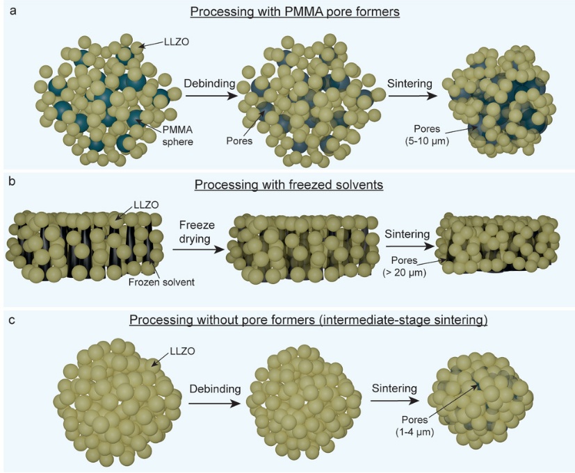 【图1】多孔LLZO固态电解质制备方法示意国a)含PMMA成孔剂,b)含冷冻溶剂,c)无成孔剂(中间阶段烧结)、/p>