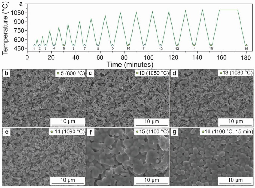 【图2】烧结过程中LLZO膜的原位扫描电镜测量。a)LLZO膜的烧结温度分布。温度分布图上的数字表示LLZO膜的扫描电镜测量的点。b-g)选取5(T=800°C)?0(T=1050°C)?3(T=1080°C)?4(T=1090°C)?5(T=1100°C)?6(T=1100°C,持?5min)点测量的LLZO膜的SEM图像、/p>