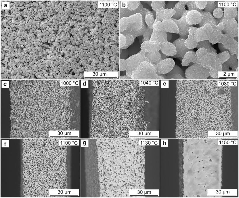 【图3】a,b)?100°C烧结15分钟的LLZO膜顶视图SEM图像。c–h)在不同温度下烧结15分钟的LLZO膜截面SEM图像、/p>