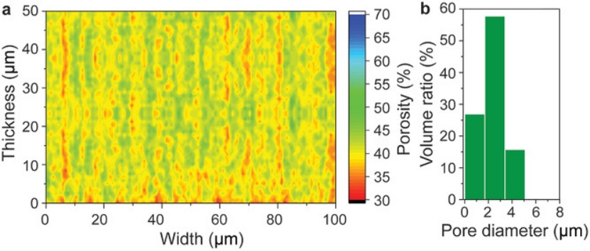 【图4】多孔LLZO膜内平均孔隙率分?a)和孔径直方图(b),由X射线计算机断层扫描数据计算、/p>