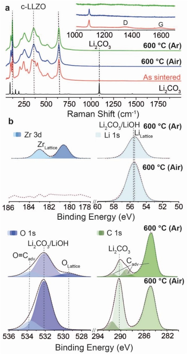 【图5】a)LLZO膜在空气(600°C,30min)和Ar(600°C,1h)中烧结和热处理后的拉曼光谱,给出Li2CO3的拉曼光谱作对比。b)烧结LLZO膜在空气(600°C,30min)和Ar(600°C,1h)热处理后电荷修正的Li1s,Zr3d,C1s和O1sXPS谱、/p>