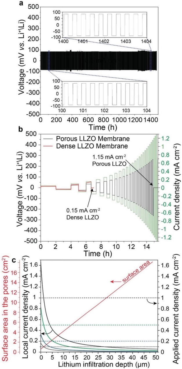 【图6】a)在电流密度为0.5mAcm-2,面积容量限制为0.1mAhcm-2的室温下,Li/多孔LLZO?Li对称电池的电压分布。b)Li/多孔LLZO?Li和Li/致密LLZO?Li对称电池的临界电流密度测量,每半圈容量限制为0.1mAhcm-2。c)多孔LLZO膜内部LLZO/Li界面的表面积与电镀Li的穿透深度的关系、/p>