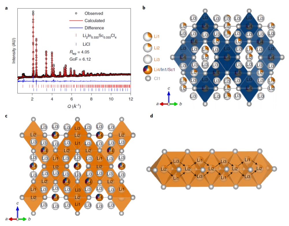 Li2In1/3Sc1/3Cl4的结构和可能的锂离子扩散途径(来源:Lailong Zhou,et al,High areal capacity,long cycle life 4?V ceramic all-solid-state Li-ion batteries enabled by chloride solid electrolyte(/span>