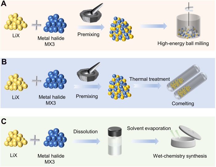 卤化物固态电解质的合成方法。(A)高能球磨;(B)共熔法;(C)湿化学合成。(来源:Changhong Wang,et al,Prospects of halide-based all-solid-state batteries:From material design to practical application(/span>