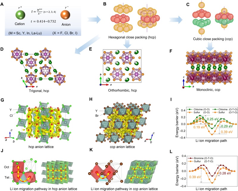 卤化物固态电解质的结晶学和离子传输动力学。(A)正负离子晶体半径比;(B)卤素离子的六方密排结构;(C)卤素离子的立方密排结构;(D)含hcp阴离子排列的三角晶体结构(Pm1);(E)含hcp阴离子排列的正交晶体结构(Pnma);(F)含ccp阴离子排列的单斜晶体结构(C2/m);(G)Li3YCl6(类似hcp的阴离子晶格)和(H)Li3YBr6(类似cp的阴离子晶格)的晶体结构,黄色标记为AIMD模拟得到皃span style="font-size: 14px; text-align: center;">Li+概率密度;(I)在hcp亚晶格中单个Li+迁移的能量分布图;(J)Li3YCl6?span style="font-size: 14px; text-align: center;">Li+的迁移路径;(K)Li3YBr6?span style="font-size: 14px; text-align: center;">Li+的迁移路径;(L)ccp亚晶格中单个Li+迁移的能量分布图。(来源:Changhong Wang,et al,Prospects of halide-based all-solid-state batteries:From material design to practical application(/span>