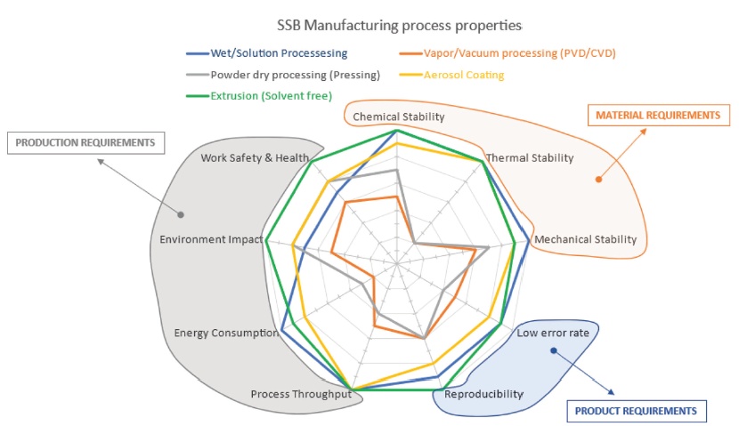 作者比较了SSB的不同制造工艺。考虑到成本问题和高误差率或缺乏再现性,气相涂层技术基本上可以被排除。等离子或火焰技术也被排除在外,因为在加工过程中材料的热稳定性有限。因此,只有少数湿涂层工艺在限制范围内。然而,所有湿涂层工艺都依赖于溶剂的使用,因此在最终被选择为潜在合适工艺的之前,必须考虑额外的因素。这些主要与环境问题和工作场所危险预防有关、/p>