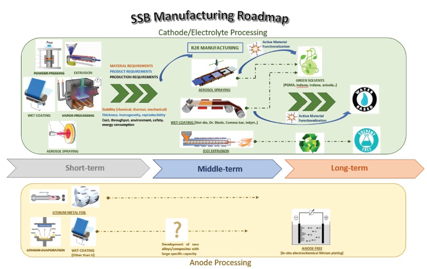 SSB制造最有可能的路线图如?所示。关于阴极和电解质的加工,有三种平行的方法可用于尝试在中短期内以低成本和高产量的工艺放大和大规模制造SSB。关于阳极制造,锂金属箔在中短期内仍将是首选。如果开发出比容量大的新合金和复合材料并对其进行功能化以使其可溶,湿法涂层工艺在中长期内也是一种选择。当电池充电时,通过电化学电镀原位沉积锂的无阳极设计毫无疑问是一种非常有前途的长期替代方案,随着技术的成熟和新材料的研?开发,它将被逐渐引入、/p>