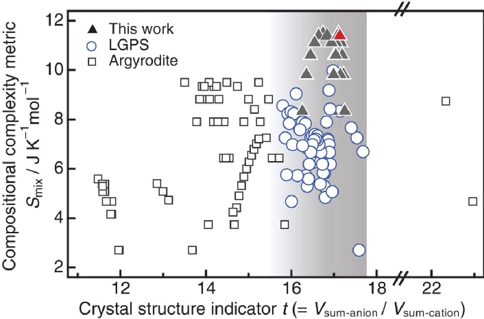 ?|所报道的LGPS型(空心圆圈)和硫银锗矿型(空心方块)电解质的晶体结构指标(t,阴离子与阳离子的体积比)与成分复杂性度量(Smix)之间的关系、/p>