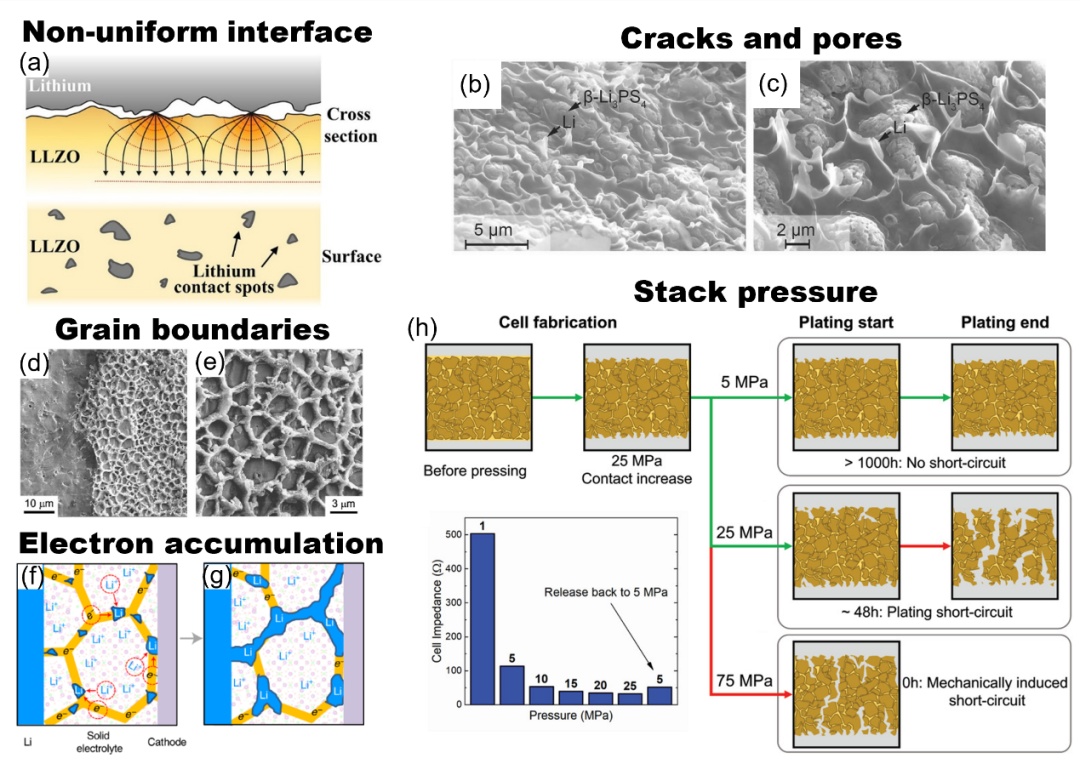 ?.(a)SE和Li金属之间的不均匀界面接触导致热点处的电场放大,从而引发Li枝晶生长;经许可复制,版权所?019,AmericanChemicalSociety。(b-c)断裂的LPSSE表面的SEM图像,显示在SE聚集体之间的裂纹和孔隙处的Li枝晶生长;经许可复制,版权所?017,WILEY¬CHVerlagGmbH&Co.KGaA,Weinheim(d-e)SEM图像显示了沿石榴石SE晶界的Li枝晶生长;经许可复制,版权所?016,ElsevierLtd。(f-g)示意图表明,晶界处的小禁带和电子积累导致锂枝晶生长;经许可复制,版权所?021,Xiao ming Liu etal.under exclusive licence to Springer Nature Limited。(h)示意图显示了堆叠压力对SE中锂枝晶扩展和电池阻抗的影响。经许可复制,版权所?019,WILLEY¬CHVerlagGmbH&Co.KGaA,Weinheim