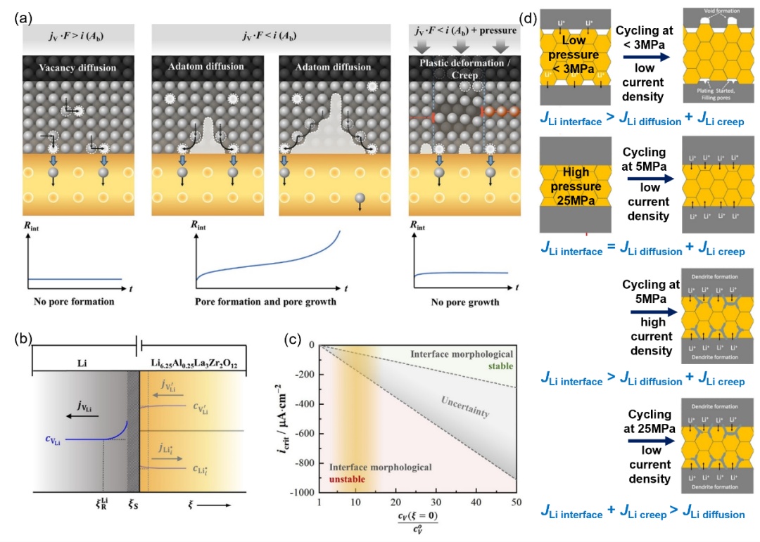 ?.(a)示意图显示,如果剥离电流密度超过Li空位的扩散极限,则在Li/SE界面处形成空洞,外部压力导致Li蠕变,从而阻止空洞形成;(b)显示Li空位扩散的示意图,在Li金属中由Li空位浓度梯度控制;(c)CCD相对于SE/Li界面处的Li空位浓度与体相Li金属中的平衡Li空位浓度之间的比率的变化;(a-c)经许可复制,版权所?019,AmericanChemicalSociety。(d)施加的压力和电流密度影响电化学反应导致的界面Li离子迁移、Li蠕变导致的Li扩散和体相Li金属中空位促进的Li扩散之间的关系,这决定了SE/Li界面处的空位和Li枝晶的形成。经许可复制。[85]版权2020,AmericanChemicalSociety、/p>