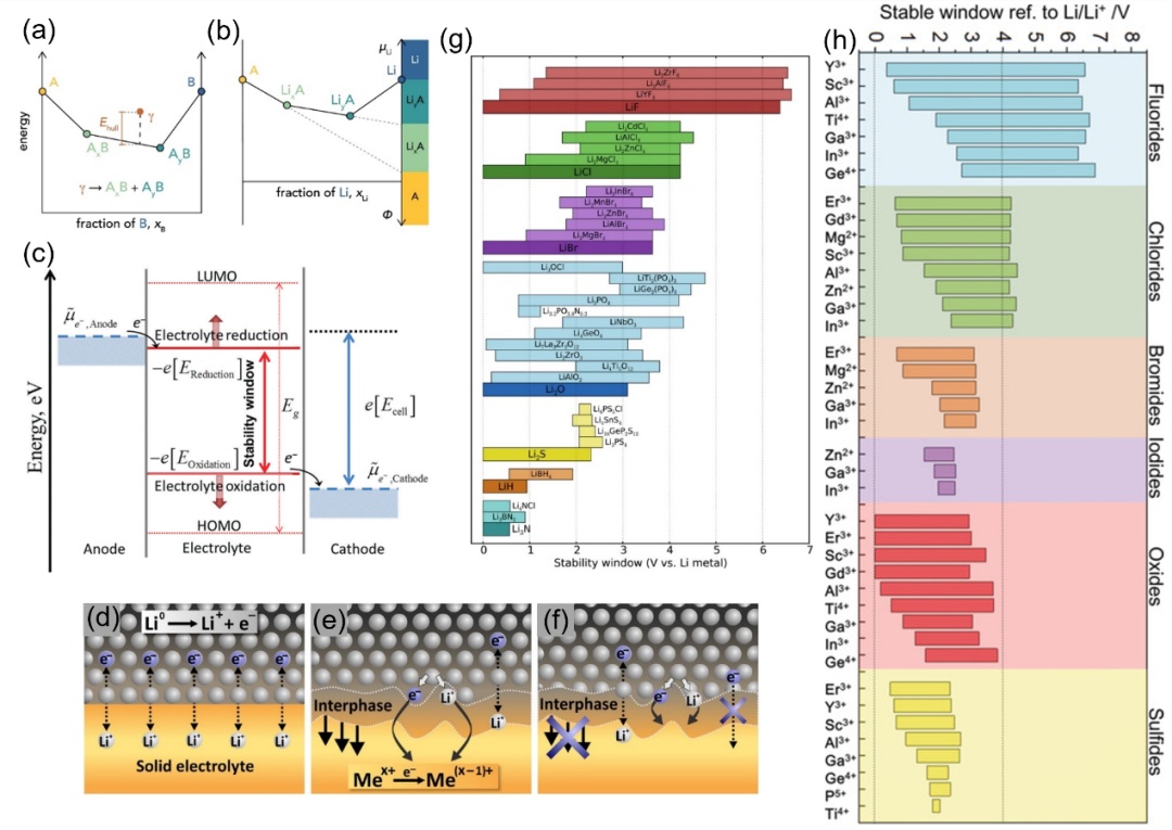 ?.(a)显示元素A和B之间相稳定性的巨电势相图;(b)揭示A在不同Li化学势下稳定性的巨电势相图;(a-b)经许可复制。[99]版权所?018,ElsevierInc.(c)阳极锂化学势高于电解质还原极限导致电解质的锂化和还原,阴极锂化学势低于电解质氧化极限导致电解质的脱锂和氧化;经许可复制,版?018,RoyalSocietyofChemistry。(d)不发生SE分解的理想SE/Li界面有助于快速锂离子传输;(e)SE分解形成的混合导电界面导致界面处持续SE分解;(f)具有低Li离子电导率的纯Li离子导电界面相阻碍Li离子传输但抑制SE进一步分解;(d-f)经许可复制,版权所?015,ElsevierB.V.(g)理论计算各种SE的电化学稳定性窗口;经许可复制,版权所?015,AmericanChemicalSociety。(h)理论计算具有不同阳离子的各种SE的电化学稳定性窗口。经许可复制,版权所?019,Wiley¬CHVerlagGmbH&Co.KGaA,Weinheim
