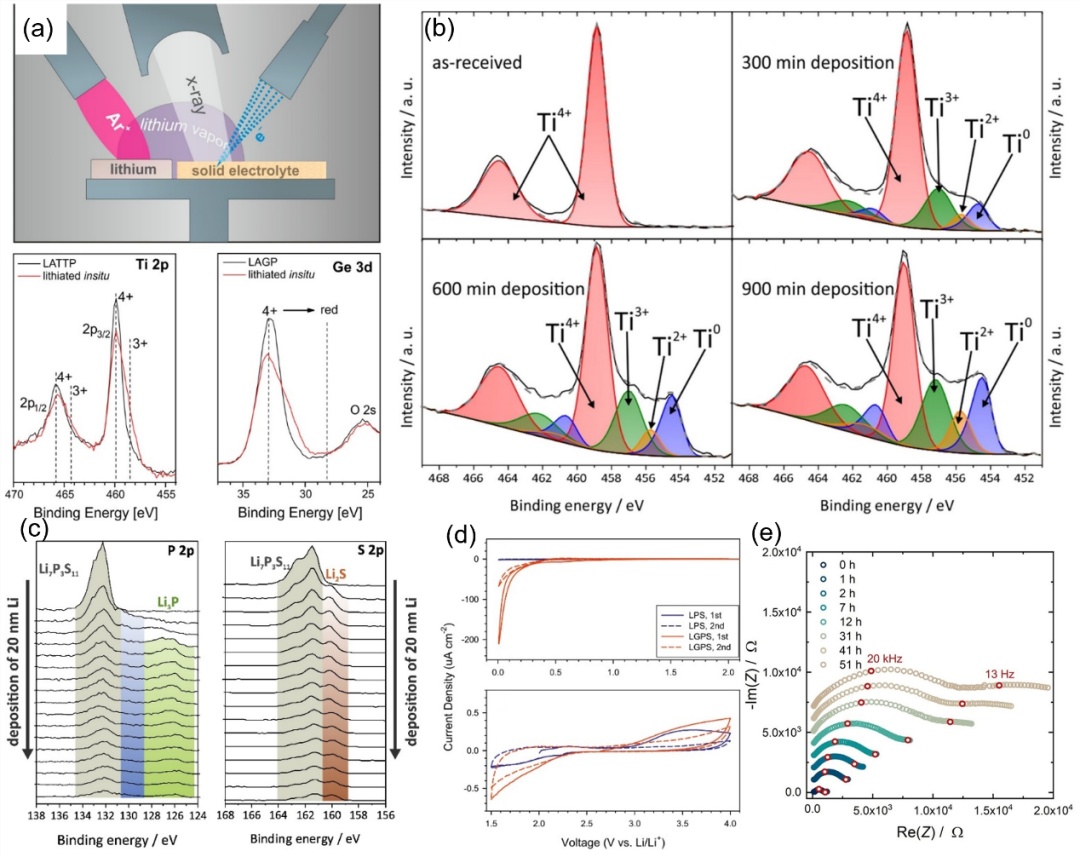 ?.(a)NASICON型SE的原位XPS装置和Ti2p和Ge3d的光谱示意图;经许可复制,版权所?013,AmericanChemicalSociety。(b)原位XPS光谱显示,在不同Li沉积时间,LLTO中Ti的还原;经许可复?版权所?015,ElsevierB.V.(c)P2p和S2p原位XPS光谱显示Li7P3S11的还原以及锂化后Li3P和Li2S的形成;经许可复制,版权2015,ElsevierB.V.(d)循环伏安法表明,LGPS在第一和第二个循环中分解,而LPS由于钝化层的形成而在第二个周期中达到稳定;经许可复制,版权所?014,Elsevier。(e)时间分辨阻抗谱显示,由于Li3InCl6在Li阳极侧的连续还原,对称Li/Li3InCl6/Li电池的界面电阻随着时间的增加而增加,光谱叠加?k的位移且没有重新缩放。经许可复制,版权所?020,LuiseM.Riegger,etal.AngewandteChemie,WileyVCHGmbH、/p>