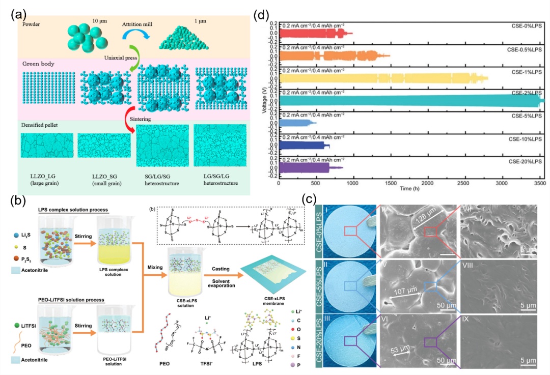 ?.(a)显示了制造具有不同晶粒尺寸的LLZO的程序示意图;经许可复制,版权所?015,AmericanChemicalSociety。(b)生产LPS–PEO–LiTFSI复合固体电解质(CSE)膜的实验程序示意图;(c)显示LPS–PEO–LiTFSI复合固体电解质膜表面形态的光学和SEM图像;(d)使用LPS–PEO–LiTFSI复合固体电解质膜(具有不同LPS含量)在0.2mAcm-2恒电流充?放电下的Li对称电池的循环性能。(b-d)经许可复制,版权所?022,WileyVCHGmbH、/p>