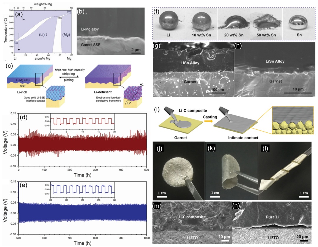 ?.(a)Li-Mg合金的相图;(b)SEM图像显示了Li-Mg合金和石榴石SE之间的紧密接触;(c)示意图显示了在Li沉积/剥离之后在Li-Mg/石榴石SE界面处保持紧密接触;Li-Mg/Ta掺杂LLZO/Li-Mg对称电池在(d?mAcm-2和(e?mAcm-2恒电流充放电下的循环性能;(a-e)经许可复制,版?018,WILEY-VCHVerlagGmbH&Co.KGaA,Weinheim。(f)不同Sn含量的熔融Li-Sn合金对LLZO型SE的润湿性;(g-h)显示Li-Sn和LLZO型SE之间紧密接触的SEM图像;(f-h)经许可复制,版权所?017,WILEY-VCHVerlagGmbH&Co.KGaA,Weinheim。(i)示意图显示了锂-石墨复合材料对掺杂Ta的LLZO的高润湿性;(j-l)显示锂-石墨复合材料的高柔性的光学图像;SEM图像显示(m)Li石墨复合?(n)纯Li和掺杂Ta的LLZO之间的接触。(i-n)经许可复制,版权所?019,WILEY-VCHVerlagGmbH&Co.KGaA,Weinheim、/p>