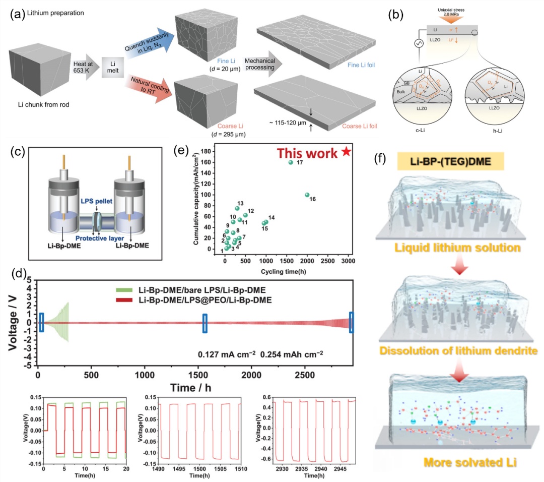 ?0.(a)示意图显示了制造具有不同晶粒尺寸的Li箔的程序;(b)显示晶粒尺寸对Li蠕变影响的示意图;(a-b)经许可复制,版?022,Janeketal.,WileyVCHGmbH?c)示意图显示了用于Li-Bp-DME液体溶液阳极的自制电池;(d)Li-Bp-DME对称电池?.127mAcm-2恒电流充放电下的循环性能;(e)Li-Bp-DME与其他液体溶液阳极的性能比较;(c-e)经许可复制,版权所?021,Wiley-VCHGmbH.(f)示意图显示了Li-Bp-DME在溶解锂枝晶中的作用。经许可复制,版权所?022,ElsevierB.V.、/p>