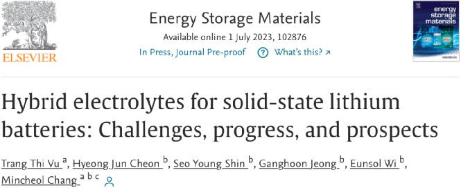 Trang Thi Vu, Hyeong Jun Cheon, Seo Young Shin, Ganghoon Jeong, Eunsol Wi, Mincheol Chang,Hybrid electrolytes for solid-state lithium batteries: Challenges, progress, and proSPEscts,Energy Storage Materials,2023,102876,ISSN 2405-8297.