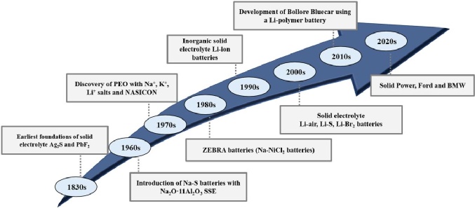 在过去的几个世纪中,SSEs的研究经历了多个关键转折点(?)。例如,?0世纪30年代初,法拉第发现固体PbF2和Ag2S在高温下表现出令人印象深刻的离子导电性,从而奠定了固态离子导电的基础。随后,20世纪60年代成为高离子导率材料的重要时期,并出现了一些具有高离子传导率的固态离子体,如Ag3SI和Na2O·11Al2O3。此后,研究人员开始将研究范围扩展到包括有机聚合物材料在内的固态离子体,如基于聚(环氧乙烷)(PEO)的电解质。同时,研究人员还开发了一些重要的固态离子导体,如LiPON。在不同的发展阶段,SSEs的研究涵盖了各种材料,包括钙钛矿、NASICON、LISICON、石榴石、Li2S-P2S5、LIBsH4和Li1.8N0.4Cl0.6等。随着时间的推移,SSEs的应用范围扩展到了新型锂电池系统,如Li-air、Li-S和Li-Br2电池。另外,固态聚合物电解质(SPEs)的快速发展也推动了含有SPEs的锂-金属-聚合物电池的应用。最近,具有mediator离子SSEs的水电池也受到了关注。宝马和福特汽车公司支持的科罗拉多州电池初创公司Solid Power?020年开始试生产创新的固态电池、/p>