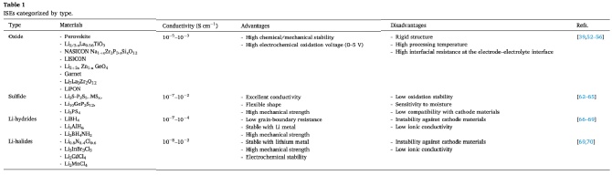 无机固体电解质(ISEs),也称为陶瓷电解质,包括晶体、偏晶(玻璃-陶瓷)和无定形玻璃,具有传导锂离子的能力。ISEs在固体电解质中展示了最高的热稳定性和离子电导率。它们被分为氧化物和硫化物,但氢化物型材料和卤化物型材料的研究较少。氧化物电解质包括NASICON、LISICON、钙钛矿、石榴石和LiPON。NASICON型化合物如Na1+xZr2P3-xSixO12和Li1+xMxTi2-x(PO4)3(M = Al,Cr,Ga,Ge,Sc,In,Lu,Y或La)展现出高离子电导率,宽电化学稳定窗口(ESW)。LISICON型电解质如Li2+2x Zn1-x XO4(X = Al、S、Si、Ge、Ti和P)通常在室温下表现出较低的离子电导率,但是空气中比较稳定。钙钛矿型SSEs中,Li3xLa2/3-xTiO3(LLTO)具有高离子电导率和锂稳定性,而Li7La3Zr2O12(LLZO)表现出高离子电导率和氧化稳定性。LiPON作为电解质在与金属锂接触时表现出高稳定性。硫化物固体电解质如Li10GeP2S12和Li3PS4展示出高离子导率和稳定性,但对湿度和高压氧化物阴极敏感。卤化物固体电解质在最近得到更多关注,但稳定性仍是主要问题。氢化物SSEs具有较低的离子电导率,需要在高温下运行。表1列出了一些氧化物、硫化物、卤化物和氢化物SSEs的特性、/p>