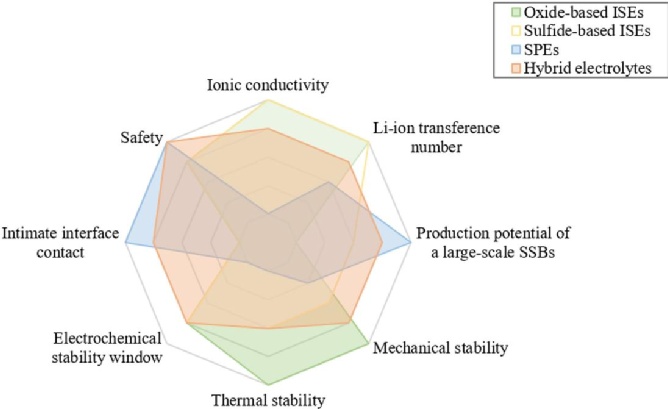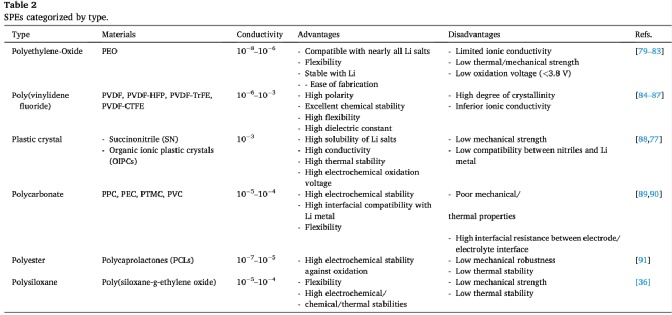固体聚合物电解质(SPEs)通常由聚合物基质和锂盐作为溶质组成(?)。其可以使用不同技术制备,主要由多种聚合物材料组成,如PEO、PEC、PPC、PTMC、PVC、PES、PAN、PA和PVDF。这些材料中,基于PEO的电解质是研究最广泛的,但其在商用电池中应用受到限制。因此,研究人员尝试通过降低PEO的结晶度和采用其他技术来提高其离子导电率。基于PVDF的SPEs是下一代锂基电池研究中的有前途的候选者,具有较强的极性、高介电常数、出色的化学稳定性和与液体电解质高亲和力。同时,塑料晶体基电解质,如琥珀腈(SN),由于高极性而表现出高离子导电性,但其低机械强度限制了广泛应用。为了解决这个问题,可以将坚固的聚合物纳入基于SN的SSEs中,以创建既具有高离子导电性又具有足够机械强度的SPEs。同时,一些聚酯基SPEs因其高电化学稳定性,特别适合与锂基电池中的高压阴极一起使用。聚硅氧烷也表现出高离子导电性和良好的电化学、化学和热稳定性。然而,单个SPEs和ISEs的评估表明它们无法单独满足所有性能要求(图2)。因此,将具有互补优势的电解质材料结合起来制造混合电解质是解决方案之一。这样的?柔性耦合电解质可以同时满足电极润湿性、锂离子导电性和机械强度的要求,以避免锂枝晶在电池中的安全问题、/p>