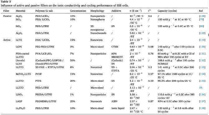 活性填料生含锂原子的陶瓷填料。这些填料在提高离子电导率方面更有效,因为它们直接参与Li+传导。带有活性填料的混合电解质可以实现高机械/热稳定性和ESW。锂离子在带有活性填料的混合电解质中的传输通常通过与被动填料相同的机制发生,包括抑制聚合物的再结晶和促进锂盐的解离。此外,这些填料可以提供额外的离子传播通道,进一步提高离子导电性。新的离子通道可以通过生成完全渗透的填料相和建立填料-聚合物界面相来实现、/p>