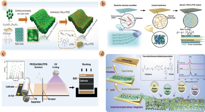 夹在阳极和阴极之间的固体电解质既是锂离子导体又是隔膜。混合电解质可以是SPEs中填充无机物,或SPEs中填充无机SSEs,也被称为复合电解质、/p>