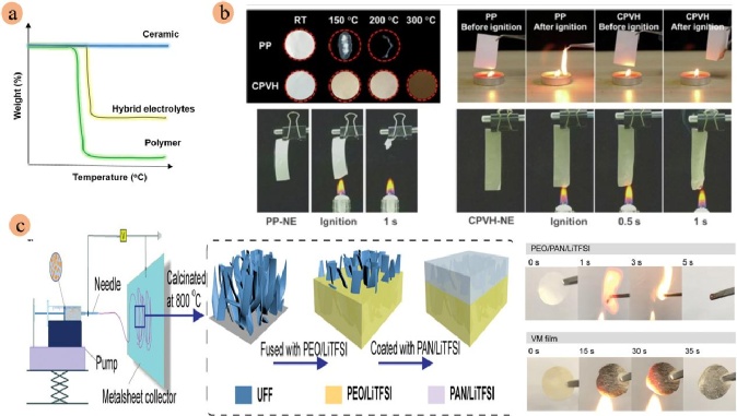 在固态电池研究中,热稳定性是一个重要考虑因素,因为传统锂离子电池中的热失控可能导致安全问题。虽然大多数聚合物电解质比液体电解质更具热稳定性,但聚合物相在300°C以上会分解,而大多数无机电解质在更高温度下保持稳定。为了提高热稳定性,可以在混合电解质中添加无机填料,这些填料可以作为骨架在高温下保持完整性,即使聚合物成分发生降解,也可以保持电极分离(?)。开发了一种耐热和耐火的纳米CaCO3基复合膜,具有优异的热稳定性和极低的热释放,可以防止电池在高温环境中短路。使用了嫁接硬陶瓷膜填料,制备了一种超薄的双层固态电解质,具有大的电化学稳定窗口和高机械强度。这种聚合物-陶瓷复合固态电解质可以在火灾中保持其形状,提高了电池的安全性能、/p>